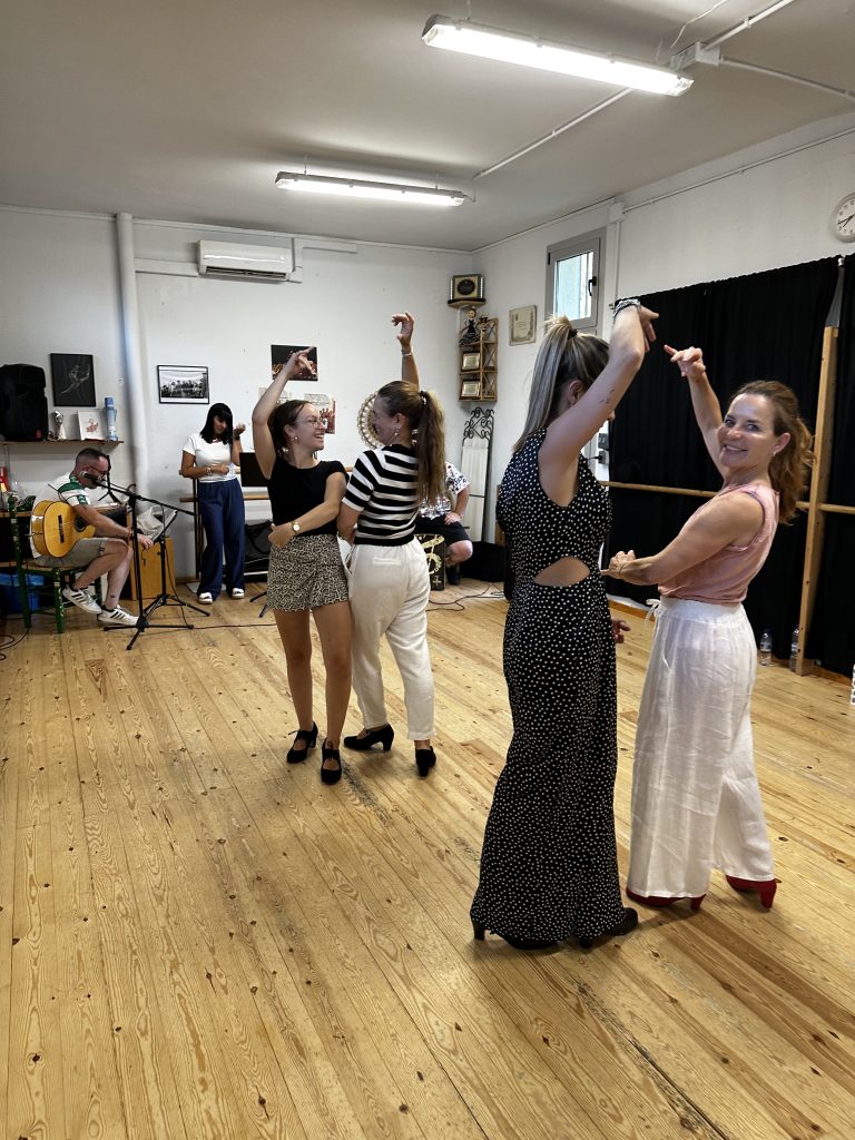 Aprenderás a bailar en pareja y con braceo las cuatro coplas, no seas exigente y perfeccionista, aprenderás a defenderte bailando sevillanas, para profundizar siempre podrás unirte a las clases regulares.